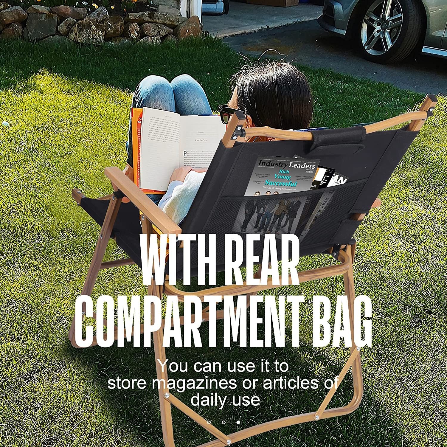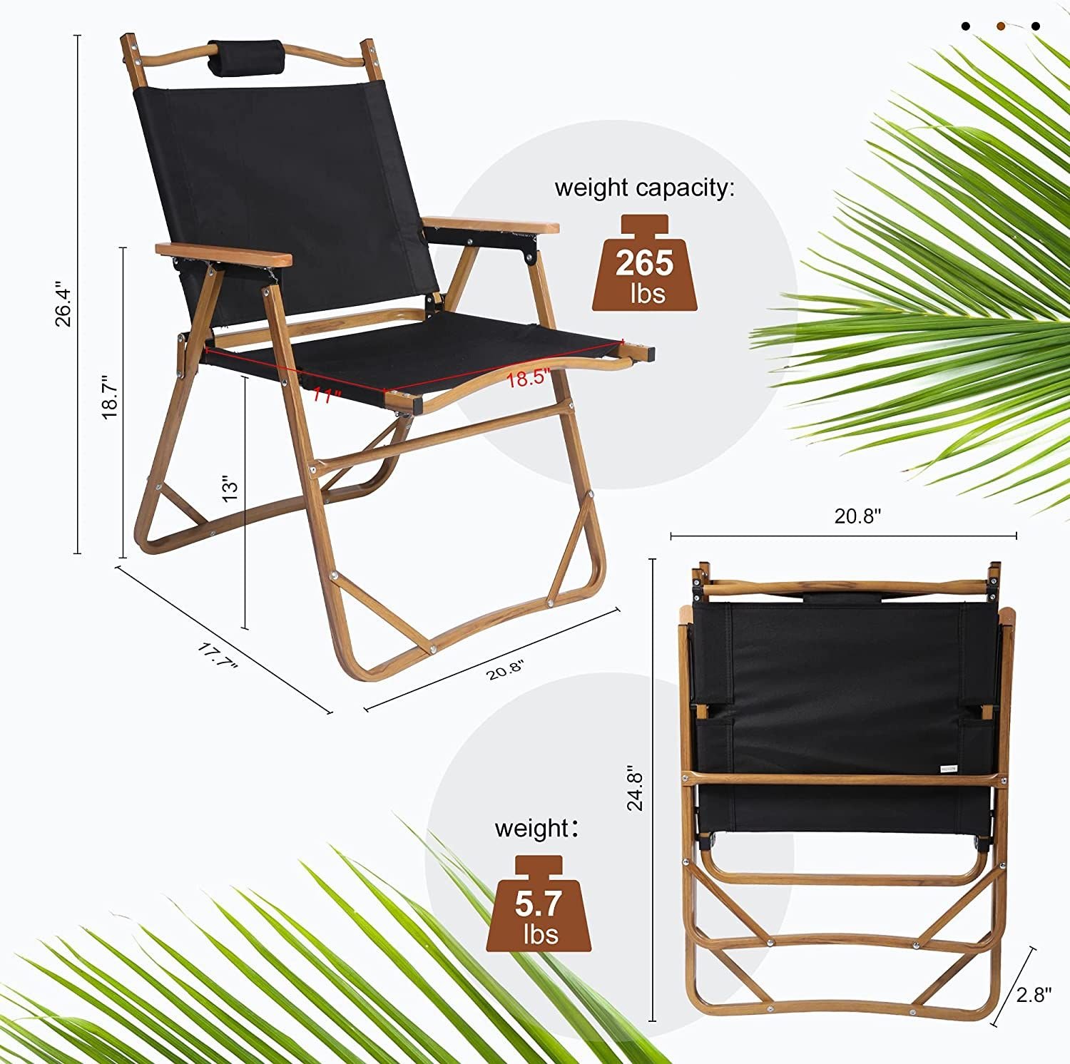 There is a multi-functional back pocket; you can store magazines or articles of daily use and to be carried at any time; practical and convenient.Our collapsible chair can be folded to 24.8" x 20.8" x 2.8"; easy to storage.Stored behind the door; in the corner; under the bed; also in the truck for outdoor use.Wood grain aluminum bracket; weight: 5.7LBS; with a bind belt can be used to tie the chair and increases the contact area of the grip to reduce the pressure.The seat is made of high density 600D Oxford Cloth; which is wear resistant and breathable; can support 265lbs(120kg). The bottom of the frame has 4 triangular structure to reinforce; more stable and safer.Set of 2; Size: 20.8" x 17.7" x 26.4". You can use this folding chair for both outdoor and indoor. Such as camping; fishing; BBQ; garden; lawns; park; music festival and anywhere you need.