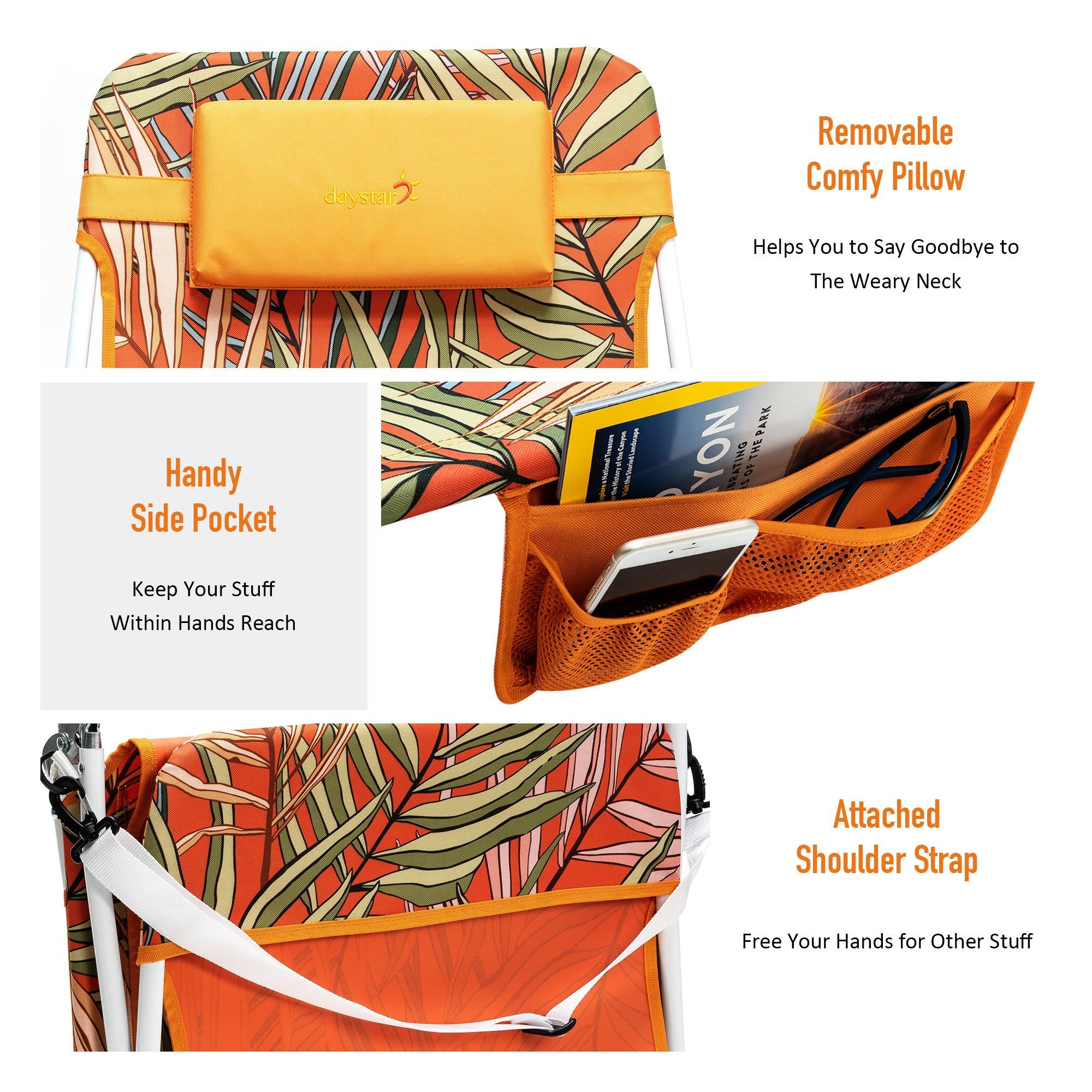 Super Handy: The attached back pocket and side storage pouches keep your drinks, sunglasses, books, phone and other gear within hands reach. The handiness of this chair makes it a must-have for outdoor activities such as camping, hiking, traveling, beach days, family picnics and sporting events.